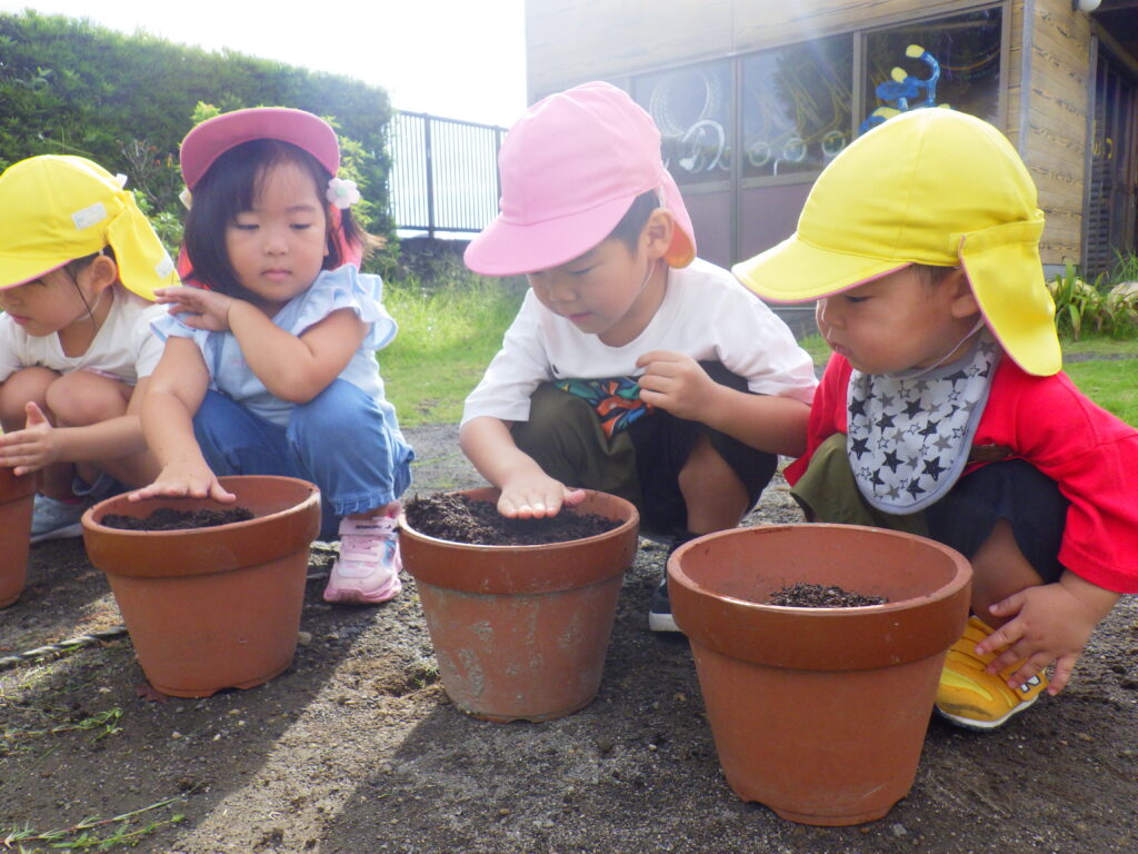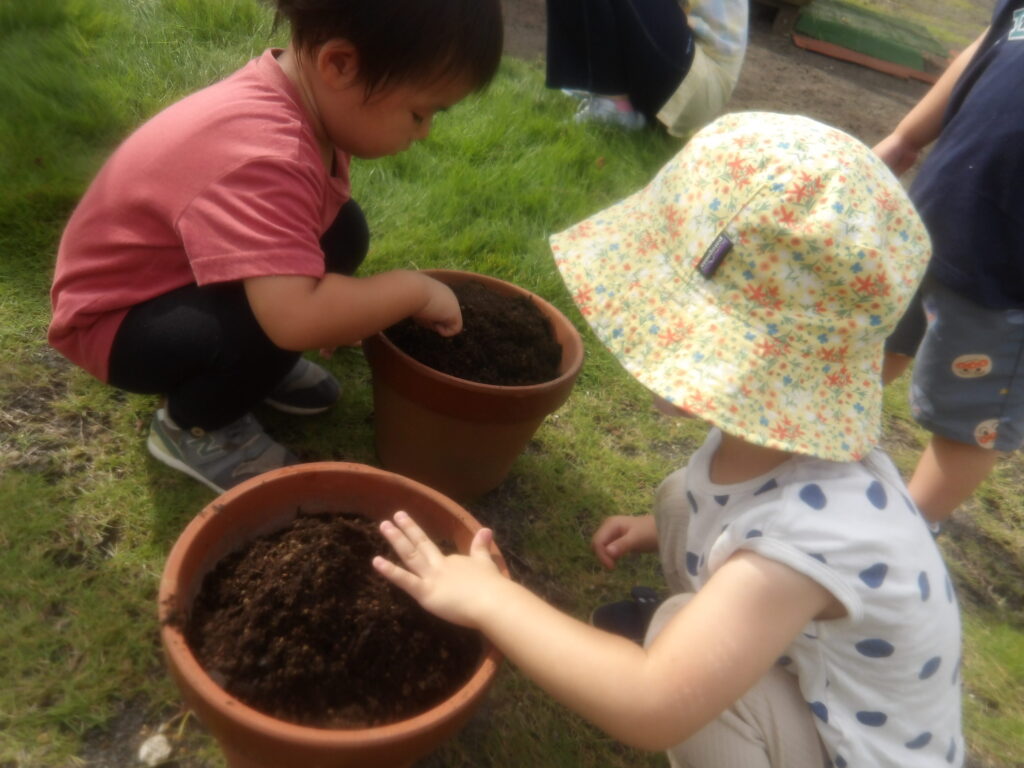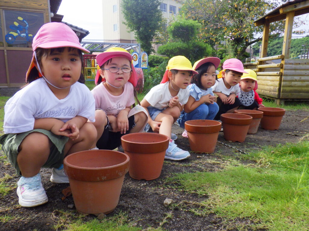 「早く咲いたらいいな~」という年長の子ども達。