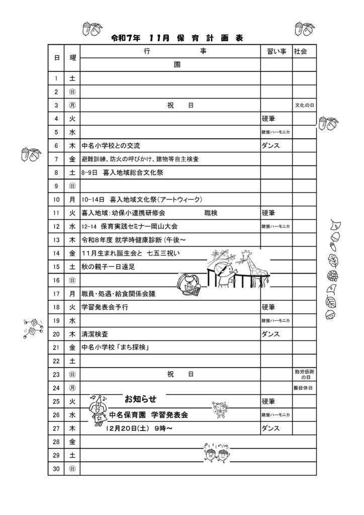 さて、11月の行事予定をお知らせいたします。