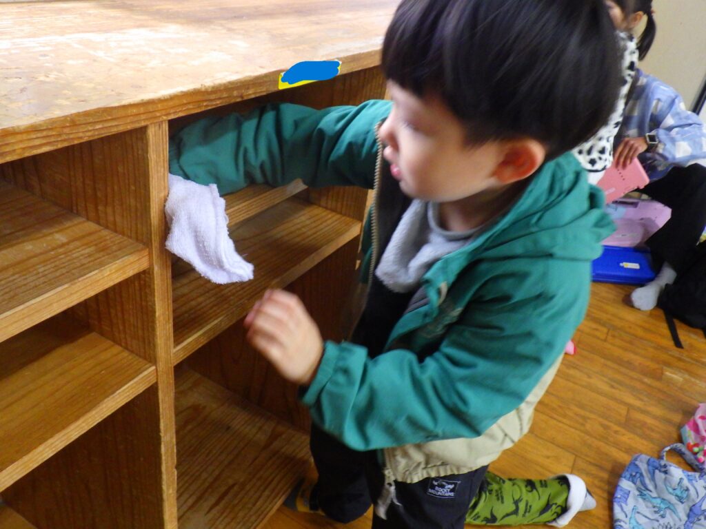 1,2歳児も「つめたい!」といいながら自分でロッカー拭きましたよ😊